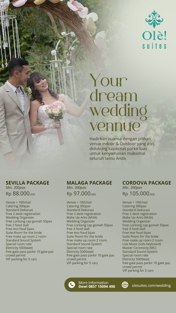 Pernikahan adalah moment kebahagiaan yang sakral dan tidak mungkin terlupakan. Olè! Suites memiliki venue pernikahan lengkap di Bogor – Sentul. Olè! Suites menyajikan 10 pilihan venue indoor dan outdoor, lengkap dengan semua layanan pendukung yang diperlukan untuk merealisasikan kreasi imajinasi Anda. Kami yakin Anda juga ingin menjadikan moment pernikahan sesuai impian.
